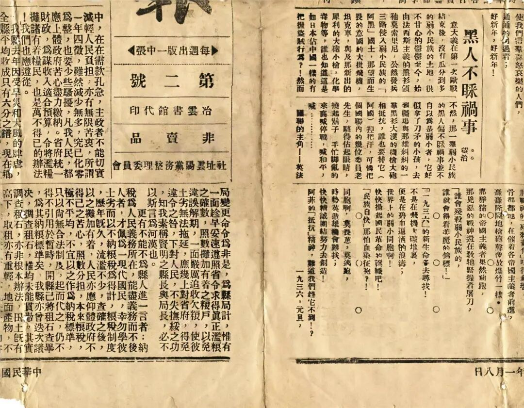 而1936年元旦頭版的一首小詩更是將抗日救亡的心聲描寫得淋漓盡致:“在催著各帝國主義者前進(jìn),轟轟隆隆地槍炮像放爆竹一樣。那猙獰的帝國主義者果然前跑,那兇惡的戰(zhàn)神還在教他緊握著屠刀,‘誰會殘殺弱小民族的,誰就會得著美麗的錦標(biāo)’。‘一九三六’的新生命會去尋找!不是在飛機大炮堆里,便是在碧血拋灑的浪濤;世界上弱小的同胞啊!快快揚起國民革命的旗幟吧!‘民族自快’哪怕血染征袍!同胞啊,莫畏葸,莫逃跑!時勢造英雄機會難找,快快精誠團結(jié)努力去創(chuàng)造!阿菲的‘抵抗’精神,難道我們趕他不到?!?/p>