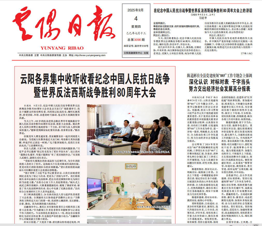 以筆為戰(zhàn),文字不滅,記錄時代,薪火相傳。從1945到2025,從《云陽公報》到《云陽日報》。每一次回望歷史,都不是為了停留,而是為了汲取前進(jìn)的力量。面對黨的重托、人民期待,我們將發(fā)揚偉大的抗戰(zhàn)精神,堅持以墨為業(yè)、以心為筆,在“數(shù)與網(wǎng)”“云與端”的時代,把光榮寫進(jìn)歷史,把奮斗帶向未來。
