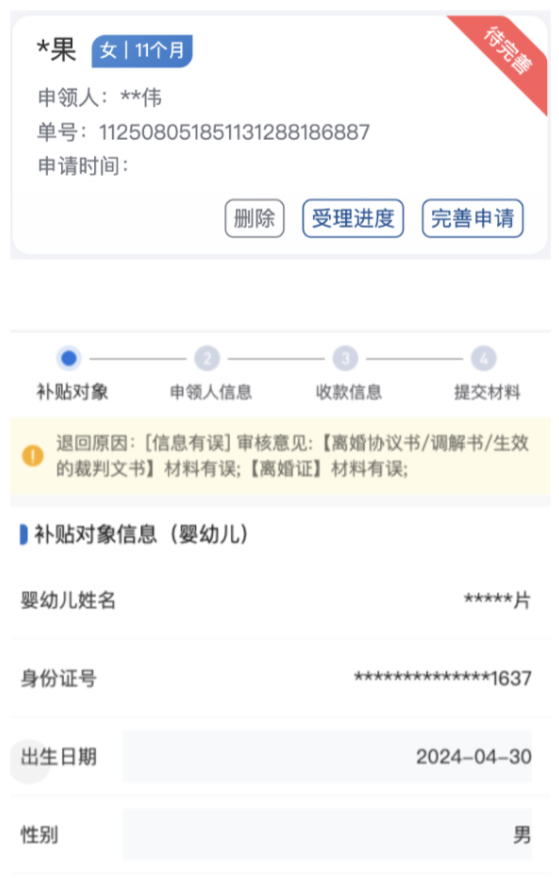 ②點擊首頁的【完善申請】按鈕,或“進度”頁面中的【完善申請】按鈕,可以繼續(xù)修改信息,最上方會顯示退回原因,方便申領人修改對應信息。