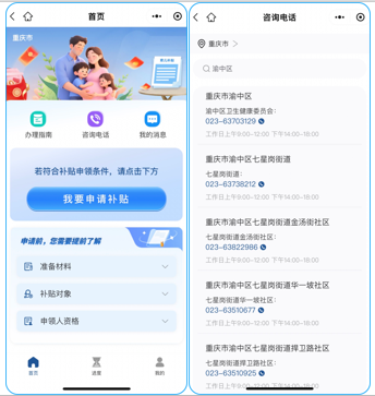 答:進入“育兒補貼申領”頁面,點擊上方的“咨詢電話”,輸入關鍵詞,可搜索您對應區(qū)縣/街道/社區(qū)的值班電話,有任何疑問,都可撥打咨詢。