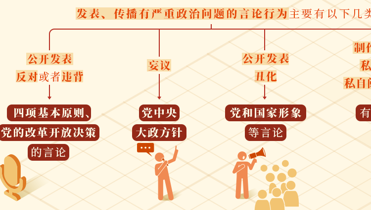 記者 吳迎花 匡寧娟 2024-04-19 17:57:27《中國(guó)共產(chǎn)黨紀(jì)律處分條例》第五十條、第五十一條、第五十二條對(duì)發(fā)表、傳播有嚴(yán)重政治問(wèn)題的言論行為列出負(fù)面清單……