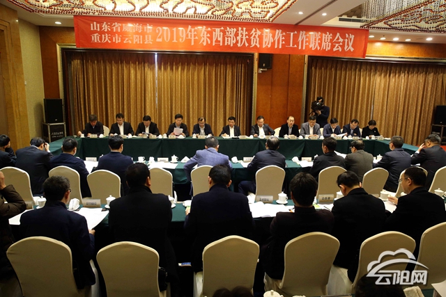 聯(lián)席會(huì)上,王魯明對(duì)云陽(yáng)近年來(lái)經(jīng)濟(jì)社會(huì)發(fā)展、脫貧攻堅(jiān)等工作給予高度評(píng)價(jià)。他說(shuō),開(kāi)展東西部扶貧協(xié)作是黨中央、國(guó)務(wù)院推動(dòng)區(qū)域協(xié)調(diào)發(fā)展、協(xié)同發(fā)展、共同發(fā)展的重大國(guó)家戰(zhàn)略,是打贏脫貧攻堅(jiān)戰(zhàn)的有效手段。多年來(lái),威海與云陽(yáng)合作交流親如一家,團(tuán)結(jié)協(xié)作,共同發(fā)展兩地經(jīng)濟(jì),優(yōu)勢(shì)互補(bǔ),相互幫助,大家結(jié)下了深厚的友誼。面對(duì)脫貧攻堅(jiān)目標(biāo)任務(wù),深切感受到責(zé)任使命重大。他表示,威海將和云陽(yáng)干部群眾一起同心協(xié)力,共同把東西協(xié)作做得更好,更實(shí),更多。根據(jù)云陽(yáng)實(shí)際需求,在農(nóng)產(chǎn)品銷售、大旅游、大健康、招商引資、企業(yè)合作、人才培養(yǎng)、干部交流、結(jié)對(duì)幫扶等方面加大支持力度,找準(zhǔn)對(duì)接口,有針對(duì)性地開(kāi)展工作,共同實(shí)施協(xié)作項(xiàng)目,發(fā)揮援助資金最大作用,不斷推動(dòng)區(qū)市、部門、企業(yè)、社會(huì)層面互動(dòng)更加有效。進(jìn)一步密切交流,緊密合作,攜手并肩共同做好云陽(yáng)和威海的東西部扶貧協(xié)作工作,共同打好打贏脫貧攻堅(jiān)戰(zhàn),促進(jìn)兩地共同高質(zhì)量發(fā)展,造福兩地人民。