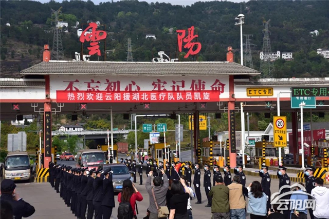 當天下午16時27分,載著12名“白衣戰(zhàn)士”的大巴車準點到達滬蓉高速云陽收費站出口。早已在高速出站口處列隊等候的公安干警齊刷刷地向醫(yī)療隊員敬禮致敬,用最崇高、最真誠的敬意,迎接援鄂的12名戰(zhàn)“疫”英雄凱旋。