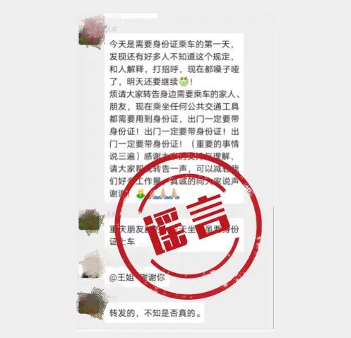 今日,有網(wǎng)傳消息稱(chēng):今日起,在重慶乘坐任何公共交通工具,均需攜帶身份證。該消息引起網(wǎng)友的廣泛關(guān)注與傳播。經(jīng)核實(shí),此消息系謠言。按規(guī)定,乘坐飛機(jī)、火車(chē)、輪船和長(zhǎng)途汽車(chē)必須持本人身份證,但是在城區(qū)內(nèi)乘坐軌道交通和公共汽車(chē)不需要身份證。同時(shí),在此提醒市民:從2020年2月8日起,對(duì)主城區(qū)老年人公交免費(fèi)卡暫停使用(持身份證也無(wú)效),直到我市突發(fā)重大公共衛(wèi)生事件一級(jí)響應(yīng)結(jié)束時(shí)恢復(fù)。