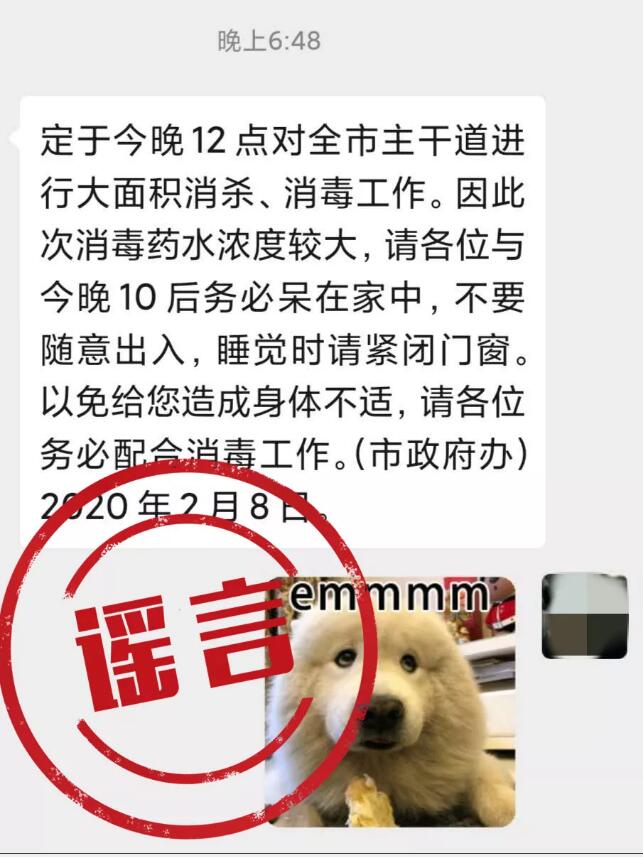 2月8日,有人在微信群傳播消息稱(chēng):今晚12點(diǎn),重慶市主干道將進(jìn)行大面積消殺消毒工作,今晚10點(diǎn),居民不得出門(mén),睡覺(jué)時(shí)需緊閉門(mén)窗。對(duì)此,經(jīng)向城管部門(mén)核實(shí),我市未安排該項(xiàng)工作。提醒大家不信謠、不傳謠,疫情防控工作請(qǐng)以政府部門(mén)公告和權(quán)威媒體報(bào)道為準(zhǔn)。
