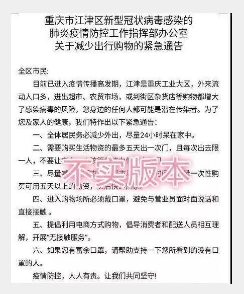 謠言3:《江津區(qū)新型冠狀病毒感染的肺炎疫情防控工作指揮部辦公室關(guān)于減少出行購(gòu)物的緊急通告》文件公布