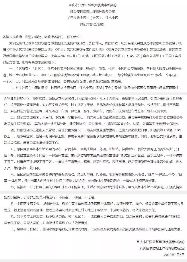 經(jīng)核查,此文件為不實(shí)版本,7日,江津區(qū)防控辦正式發(fā)布《江津區(qū)關(guān)于實(shí)施全區(qū)村(社區(qū))、住宅小區(qū)封閉式管理的通知》,決定從2020年2月7日0時(shí)起,全區(qū)所有村(社區(qū))、住宅小區(qū)實(shí)行封閉式管理,具體措施詳見(jiàn)如下: