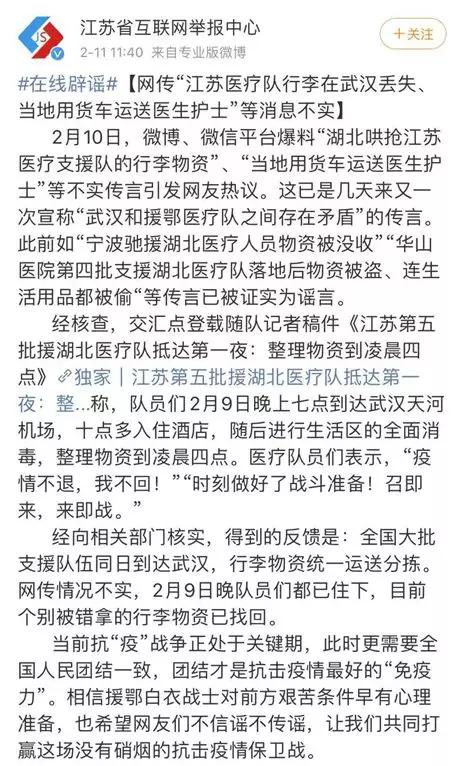 這兩天,網(wǎng)絡(luò)上出現(xiàn)多則關(guān)于支援湖北醫(yī)療隊物資丟失的傳言。其中一則是“湖北哄搶江蘇醫(yī)療支援隊的行李物資”、“當(dāng)?shù)赜秘涇囘\送醫(yī)生護士”。