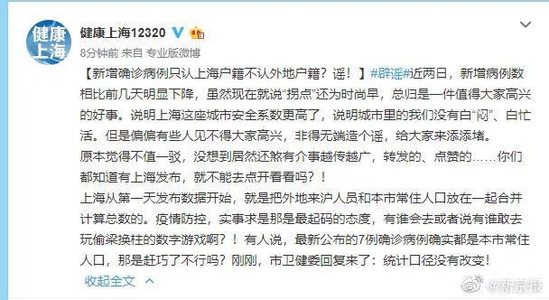 近日,一則關(guān)于上海新增確診新型冠狀病毒感染的肺炎病例統(tǒng)計人數(shù)時,只統(tǒng)計上海戶籍,不理會外地戶籍的消息流傳甚廣。