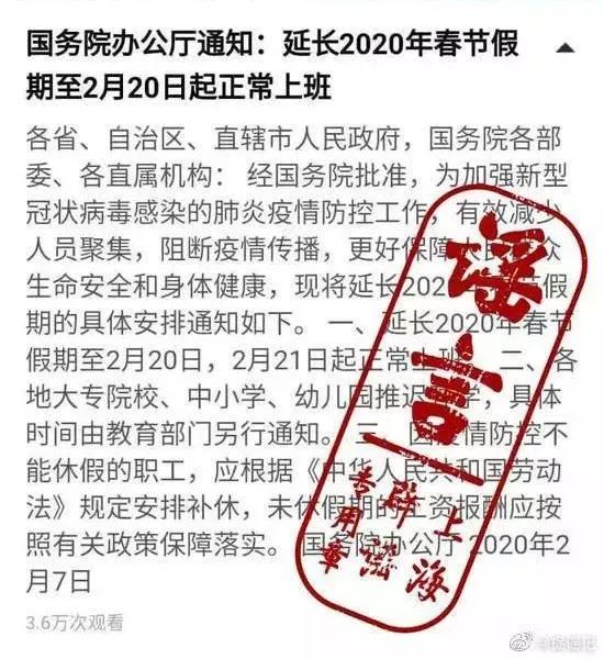 最近一張春節(jié)假期再次延長的新聞截圖在微信群里傳播,稱“因疫情防控需要,春節(jié)假期延長至2月20日,21日起上班”,通知的落款為“國務(wù)院辦公廳”,時間為“2月7日”。