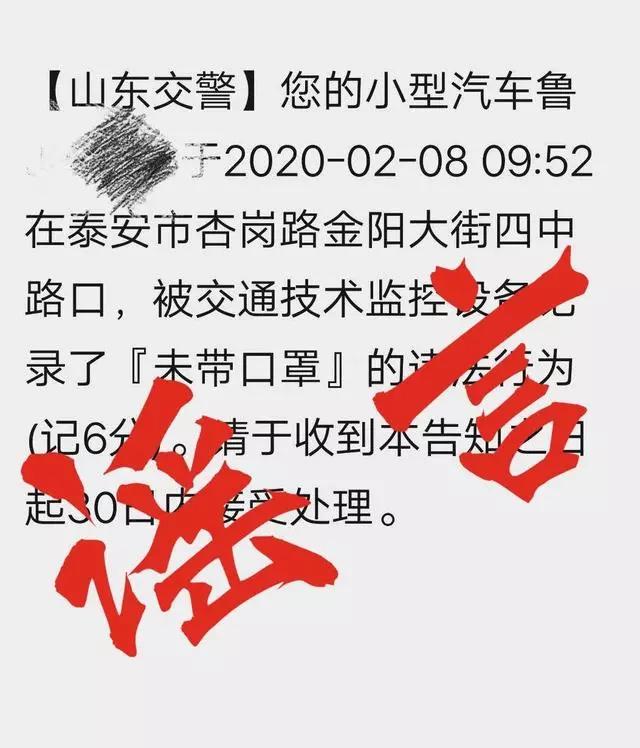近日,一張“道路交通違法告知短信”的截圖在網(wǎng)上流傳,內(nèi)容顯示為“【山東交警】您的小型汽車魯JXXXXX于2020-02-08 09:52在泰安市杏崗路金陽大街四中路口,被交通技術(shù)監(jiān)控設(shè)備記錄了[未帶口罩]的違法行為(記6分)。請于收到本告知之日起30日內(nèi)接受處理?!?/p>