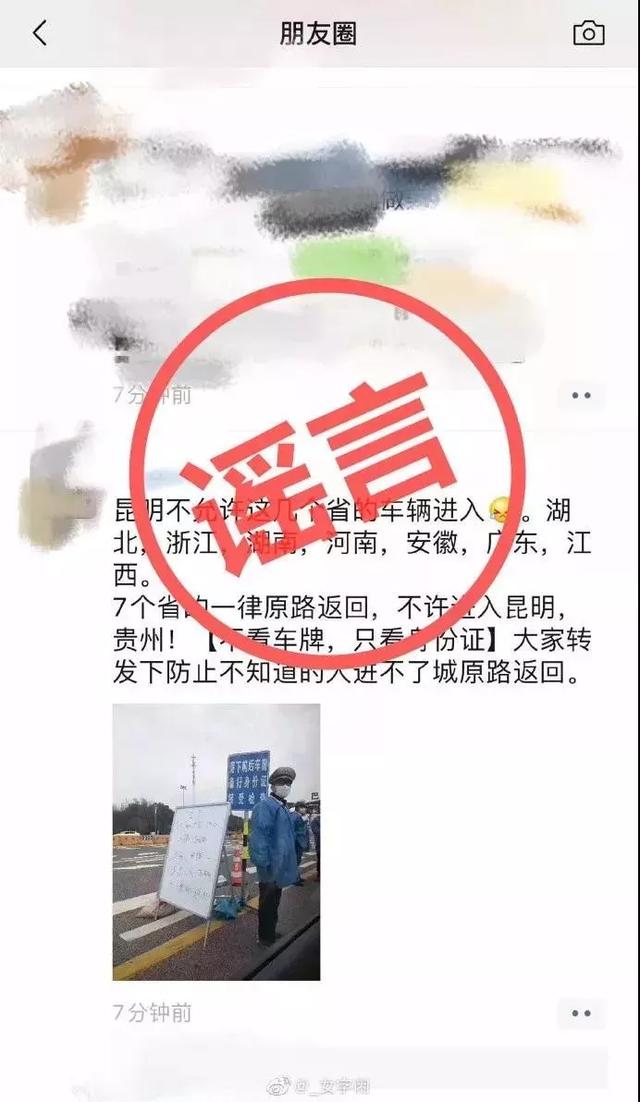 9日,網(wǎng)絡(luò)上流傳一則信息稱:“昆明不允許這幾個省的車輛進入。湖北、浙江、湖南、河南、安徽、廣東、江西!7個省的一律原路返回,不許進入昆明、貴州!”并配有圖片。