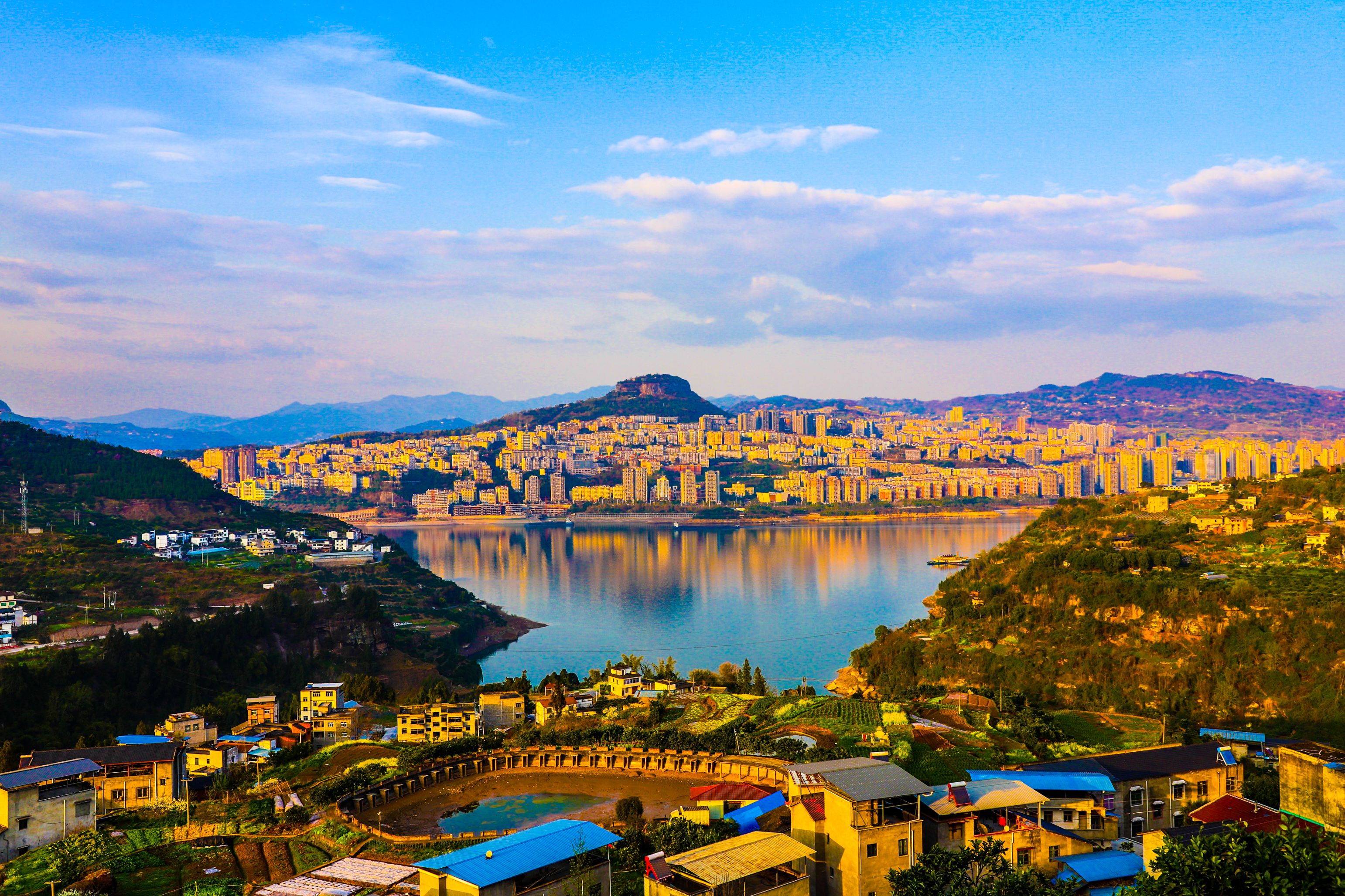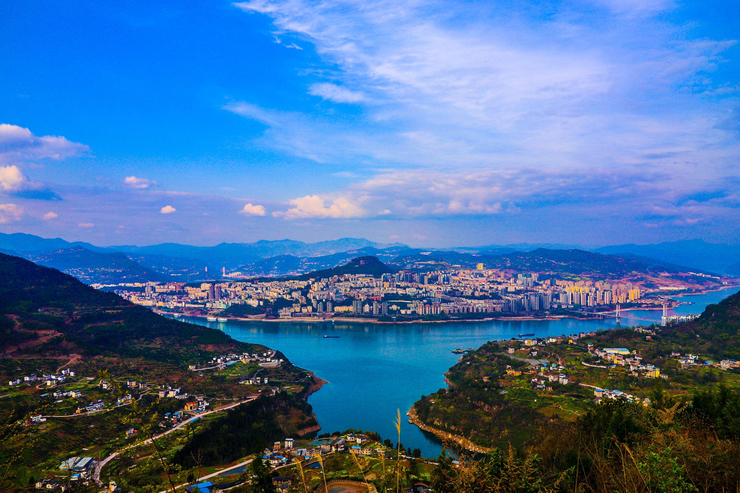 在盤龍街道陽明村觀景臺(tái)俯瞰云陽全貌,以磐石城為起點(diǎn),連綿不絕的長江水向四周蔓延,形成四角,宛如一只飛燕銜新泥。(譚啟云 攝)