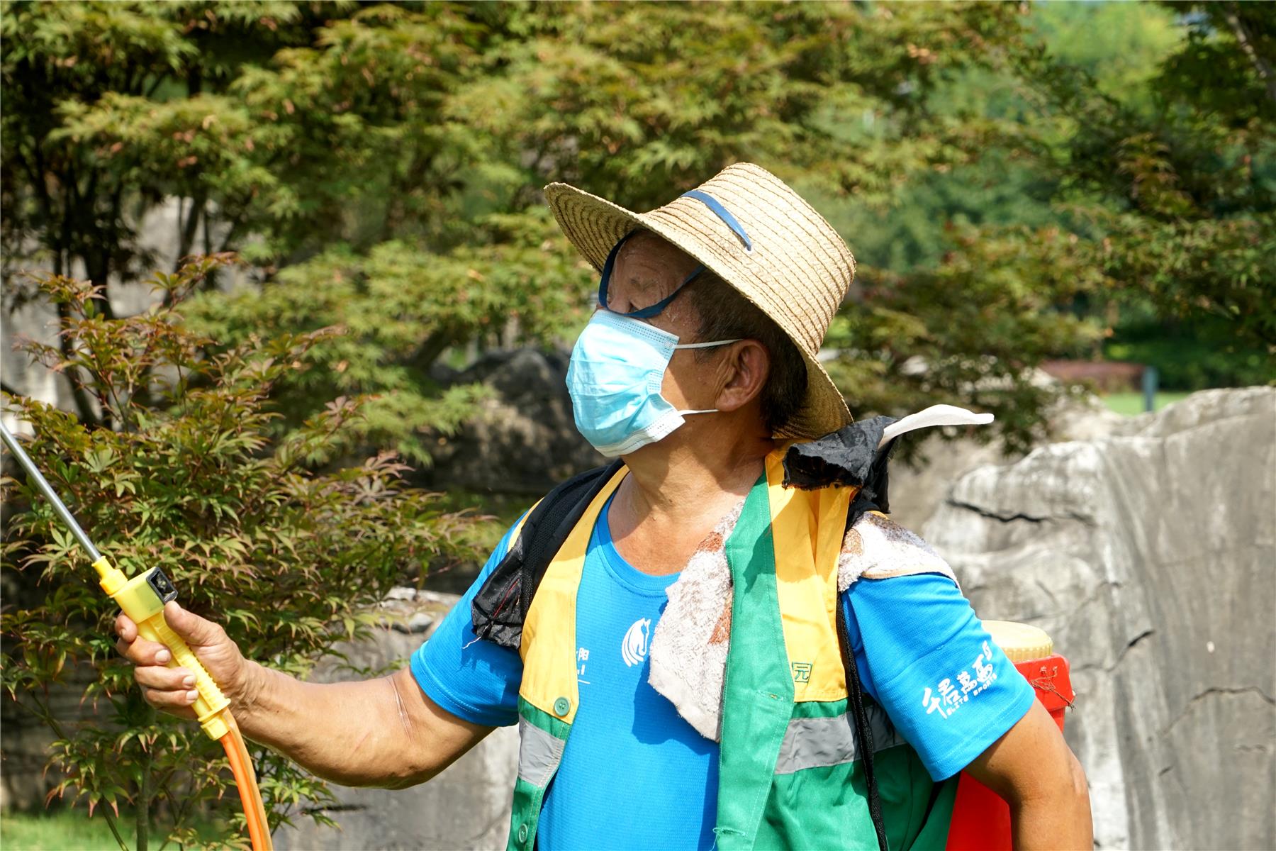 當(dāng)記者問起這么熱的天不怕熱嗎,王成剛不經(jīng)意地擦擦汗說道:“夏天來了,熱肯定是熱的,再熱我們都要盡量穿長衣長褲戴手套,雖然這樣會讓我汗流浹背,但是既能防曬又能防蚊蟲叮咬?!逼綍r在高溫下的工作,常常會讓他汗流浹背、口干舌燥,累了的時候,坐到旁邊的凳子上,用草帽扇扇風(fēng),給他自己一點緩沖時間,調(diào)整好再投入工作。王成剛的皮膚已經(jīng)被太陽曬得黝黑,但他一點也不在意,他說:“只要能做好綠化工作,苦點累點都值得?!?/p>
