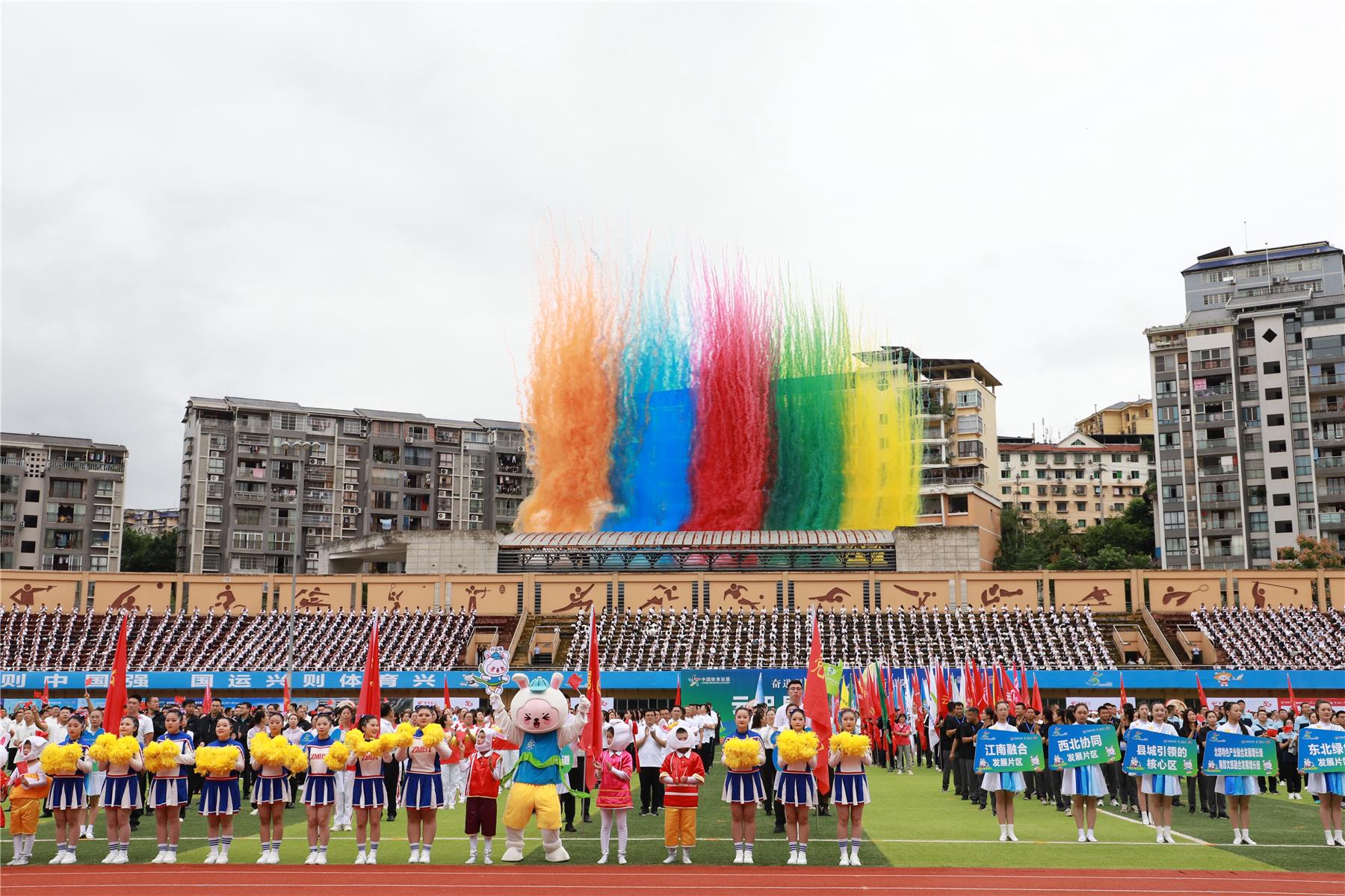 伴隨著昂揚的旋律,國旗手高擎國旗,步伐鏗鏘,護衛(wèi)著五星紅旗昂首闊步邁入會場。隨后,會旗方隊、裁判員方隊、“一心”方陣、“兩極”方陣、“西北協(xié)同發(fā)展片”方陣、“東北綠色發(fā)展片”方陣、“江南融合發(fā)展片”方陣、系統(tǒng)代表方隊、學校代表方隊、體育協(xié)會方隊陸續(xù)入場接受檢閱。