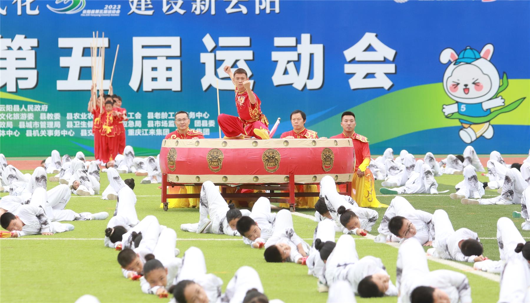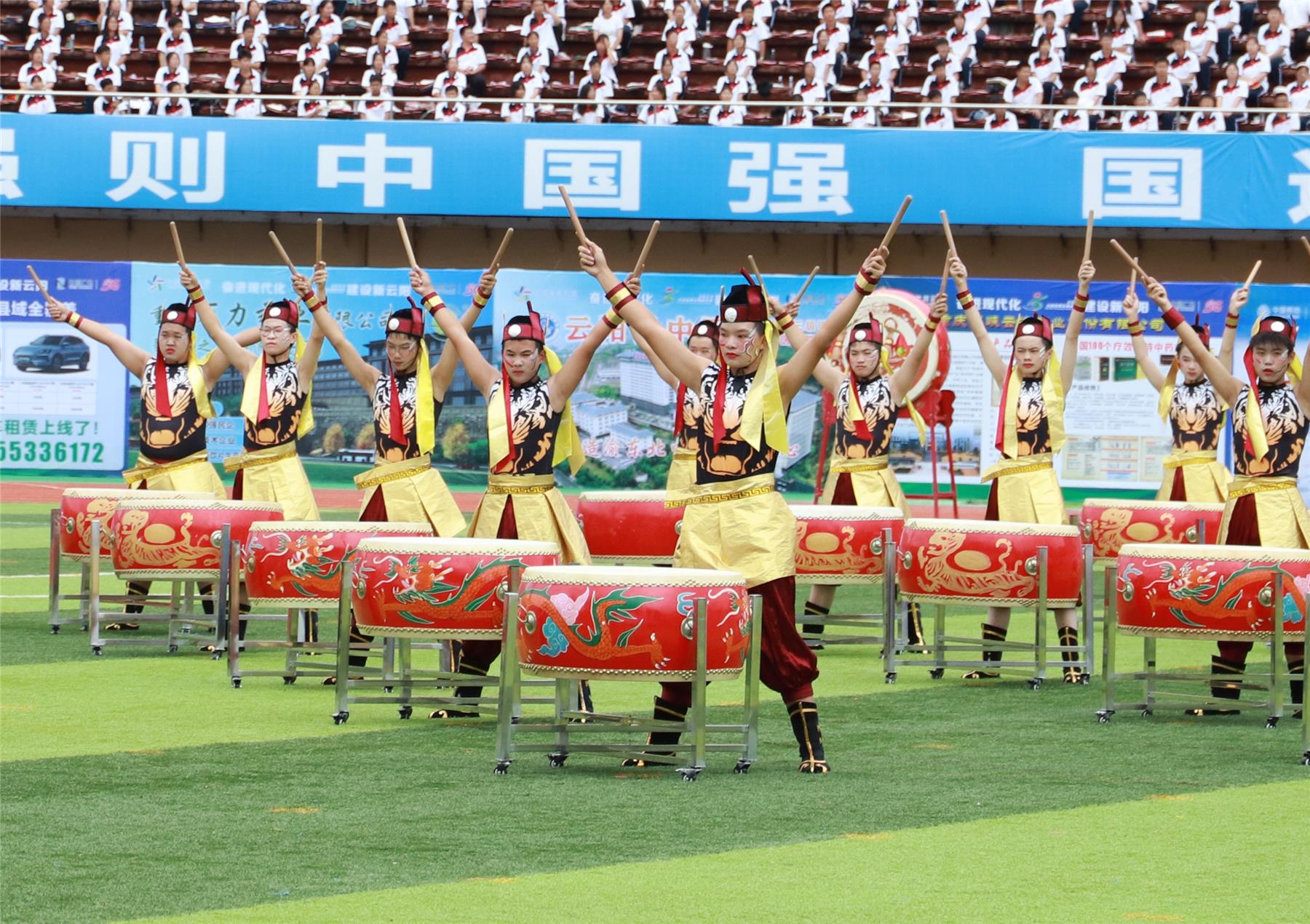 激昂嘹亮的運動員進行曲還在耳邊回蕩,進軍的號角已經吹響。開幕式現(xiàn)場,人潮涌動,氣氛熱烈。精彩的文體表演將全場觀眾的熱情點燃。鐵衣度磧雨颯颯,戰(zhàn)鼓上隴雷憑憑。在《巴風鼓韻》篇章中,場上鼓聲震天,盾牌飛舞,旌旗飄揚,幾千年來的巴人文化在這里傳承和發(fā)揚,聚民心、系團結,怡性情的巴風鼓韻預示著云陽文體旅事業(yè)繼往開來、蓬勃發(fā)展。