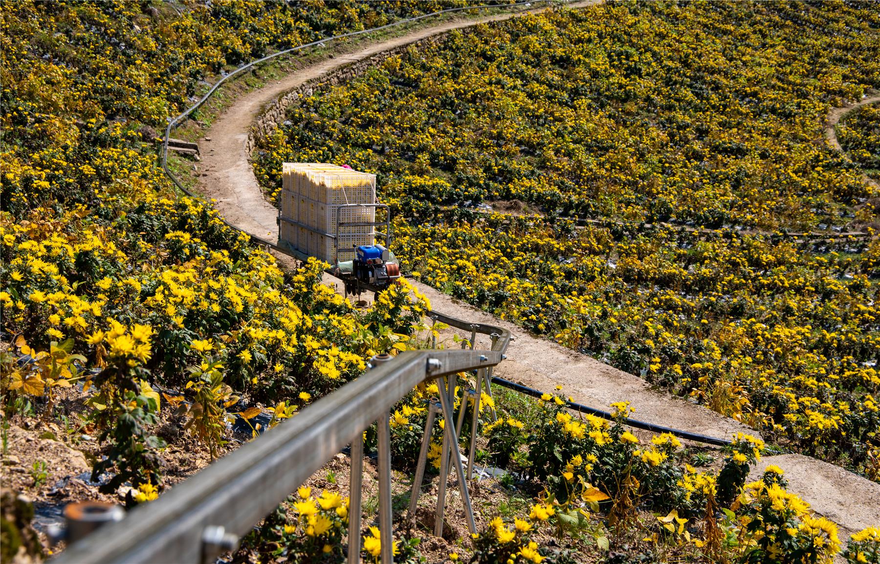 為了有效解決坡地運(yùn)輸困難、搬運(yùn)成本高的問(wèn)題,今年合作社在菊花基地一共鋪設(shè)了420米軌道,采用無(wú)人駕駛的“山地小火車”進(jìn)行運(yùn)輸,大大提升勞作效率。據(jù)了解,近年來(lái)當(dāng)?shù)貫榱舜龠M(jìn)山區(qū)產(chǎn)業(yè)發(fā)展智能化進(jìn)程,還在柑橘園等高山果園鋪設(shè)了近6萬(wàn)米軌道,既解決了豐收季柑橘下山的運(yùn)輸,也解決了管護(hù)期肥料上山的難題,有效促進(jìn)山區(qū)產(chǎn)業(yè)發(fā)展智能化進(jìn)程,推動(dòng)鄉(xiāng)村產(chǎn)業(yè)發(fā)展。