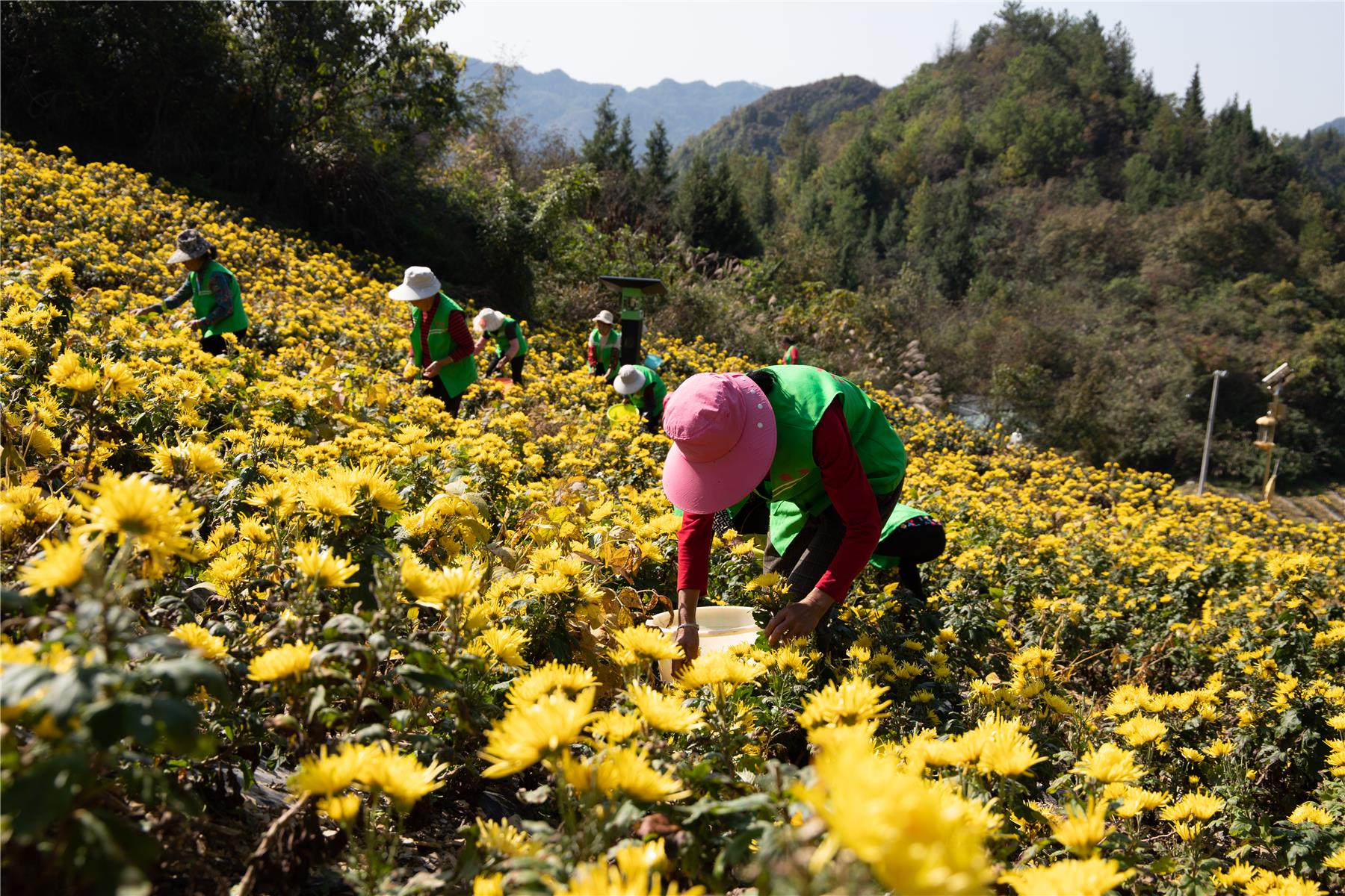 在云陽(yáng)縣堰坪鎮(zhèn)高新村菊花種植基地,放眼望去,一壟壟、一行行、一朵朵的金絲皇菊競(jìng)相綻放,滿地金黃,朵朵菊花迎風(fēng)而立,清香四溢,村民們穿梭其中,正忙著采摘綻放的菊花,呈現(xiàn)出一片豐收景象。云陽(yáng)縣鑫燾菊花種植股份合作社負(fù)責(zé)人冉秀清告訴記者,今年的氣候不錯(cuò),菊花長(zhǎng)勢(shì)良好。她帶動(dòng)農(nóng)戶種植了一萬(wàn)五千多畝菊花,能夠采摘菊花兩百多噸,能賣到三千多萬(wàn)元。