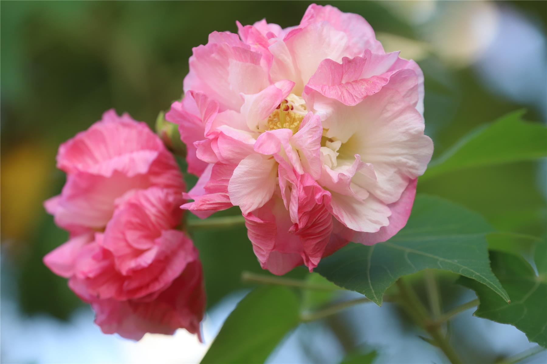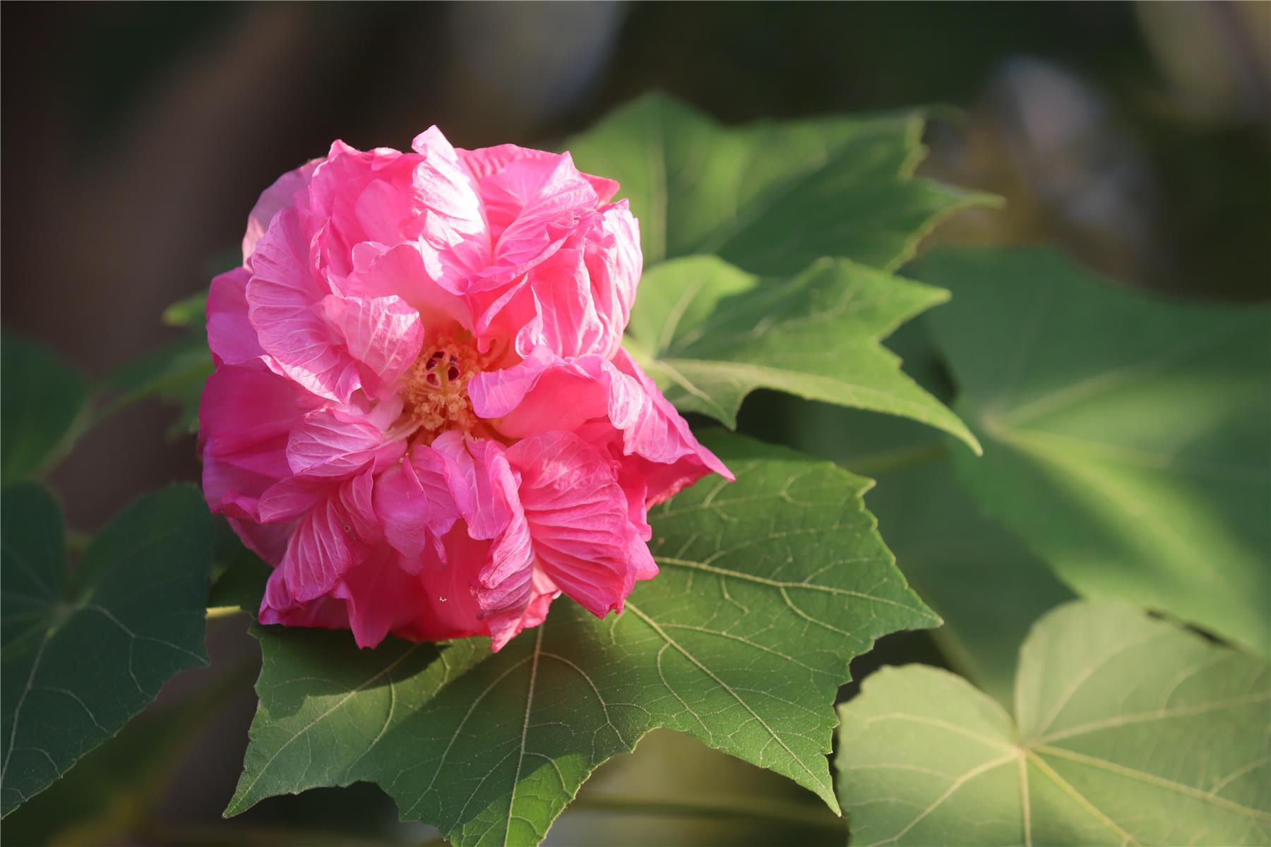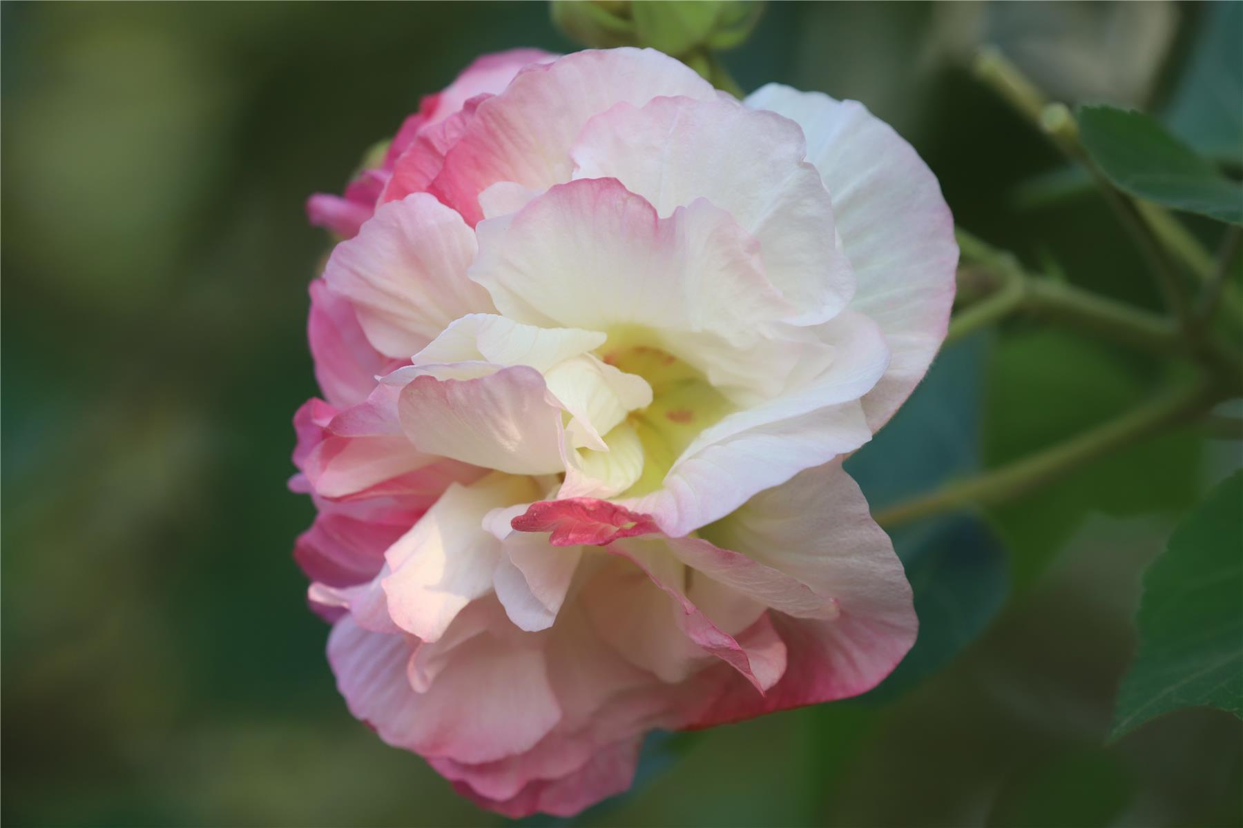 芙蓉花白如雪,粉似霞,紅白相間,宛如雪后之彩霞,花色鮮艷,姿容秀麗,展現(xiàn)深秋的風(fēng)情。微風(fēng)拂動,紅花綠葉相襯,更顯清新淡雅。在夕陽的映襯下,粉白的花瓣上鋪展著閃閃金光,雍容華貴之姿不輸牡丹,逆光之下,花瓣的脈絡(luò)清晰可見。芙蓉盛開,吸引了不少市民駐足欣賞,他們或贊嘆其美麗,或欣賞其姿態(tài),或贊嘆其芬芳。
