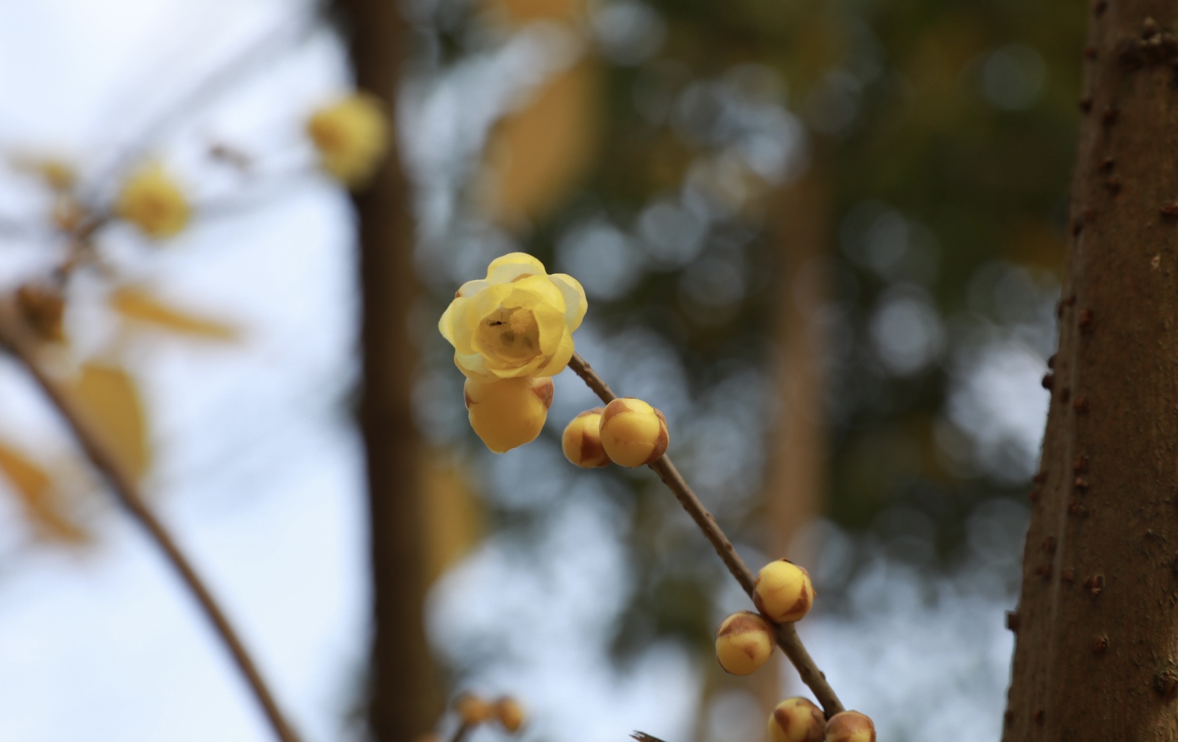 走進(jìn)云頂公園,未見其花,先聞其香。遠(yuǎn)遠(yuǎn)望去,枝條交錯,顆粒似的點綴其上。循著花香慢慢走近,才看清這臘梅花的“真面目”,嫩黃色花瓣緊密層疊,潤澤透明,圍繞著花蕊呈壇狀開放,花形精致小巧,立于枝條上,緊挨著的還有尚待開放的花苞,豆粒般大小,底端呈褐色,頂端則呈淺黃色,似是要在這寒冷冬日,沖破束縛,傲然盛放。