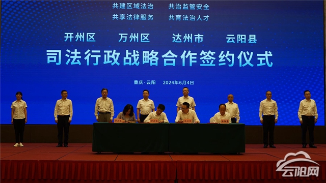云陽網(wǎng)訊(記者 李妍)6月4日,“萬達開云”司法行政戰(zhàn)略合作協(xié)議簽約儀式在我縣舉行,進一步統(tǒng)籌四地法治資源、凝聚四地法治力量,一體推進“萬達開云”區(qū)域法治建設(shè)??h委常委、政法委書記劉桂虎,副縣長薛翀出席簽約儀式。