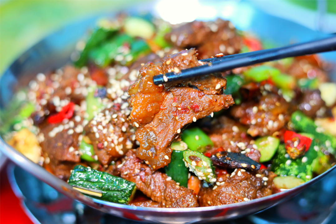 牛肉、牛雜,搭配糟辣椒、青紅椒、芹菜、黃瓜等共同炒制而成,使牛皮入口即化,牛肉的嚼勁充分詮釋出來,再加上蔬菜的爽口和內(nèi)雜的點(diǎn)綴,是一道不可多得的下飯下酒菜品。