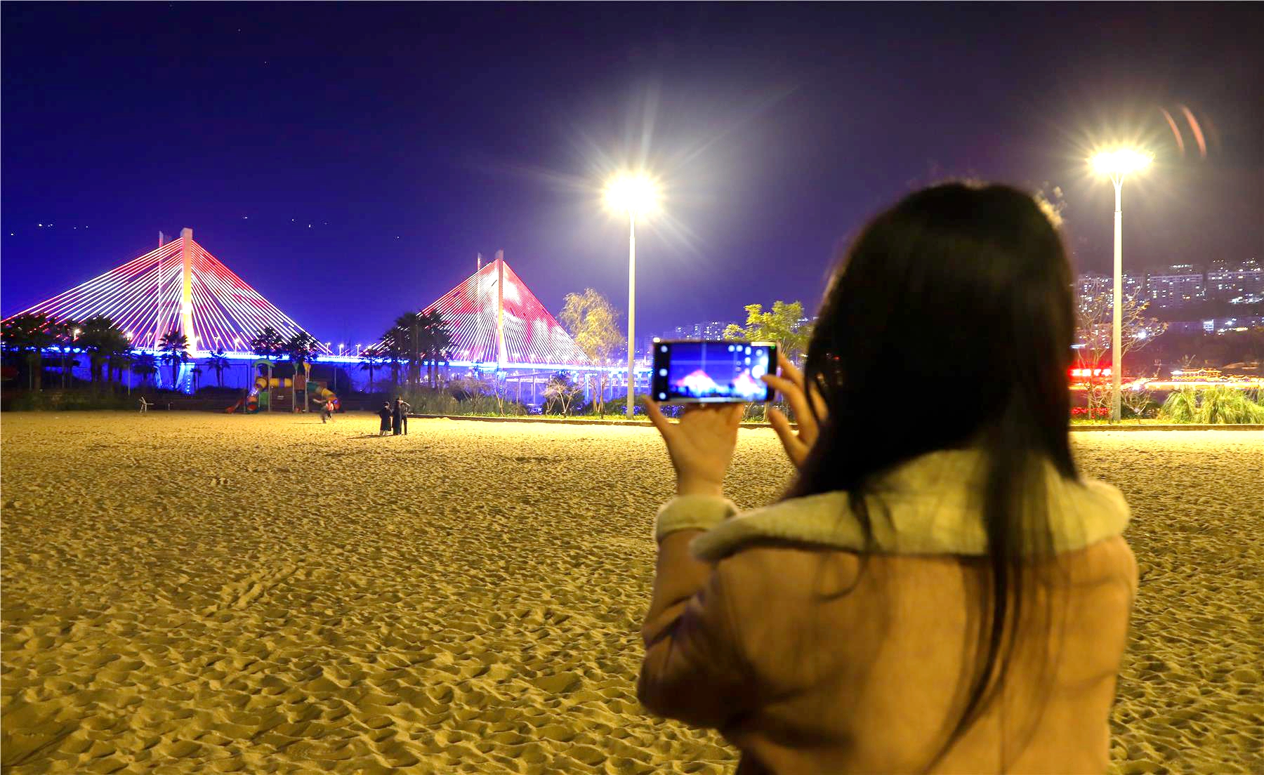 “今年云陽的迎春燈飾非常有年味,長江大橋燈光秀有很多云陽的元素,比如恐龍IP、云陽的山水等。我從遠處看,長江大橋和長江融為一體,相互映襯,如夢如幻,大橋的光影倒映在波光粼粼的江面上,勾勒出五彩斑斕的效果,讓城市的夜變得風(fēng)情萬種、絢麗多姿?!笔忻駝庒愓f。