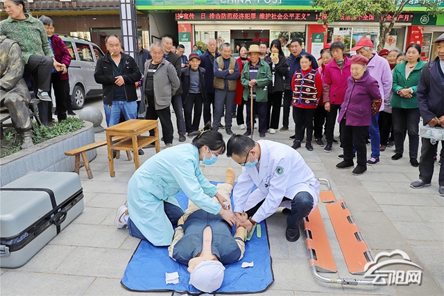 演練以連續(xù)暴雨誘發(fā)滑坡為背景,監(jiān)測員巡查發(fā)現(xiàn)滑坡體裂縫增寬、民居出現(xiàn)新裂痕,立即通過銅鑼與高音喇叭發(fā)布撤離預(yù)警。經(jīng)現(xiàn)場測試,社區(qū)3分鐘內(nèi)核實(shí)險(xiǎn)情,鎮(zhèn)政府2分鐘內(nèi)完成上報(bào),10分鐘內(nèi)啟動應(yīng)急預(yù)案,明確撤離范圍覆蓋16戶78人,一場速度與險(xiǎn)情的“競速賽”迅速展開。鎮(zhèn)衛(wèi)生院在長嶺社區(qū)廣場對群眾進(jìn)行了危急病人的心肺復(fù)蘇培訓(xùn),指導(dǎo)群眾在危急病人面前如何有效處理,做到臨危不亂。