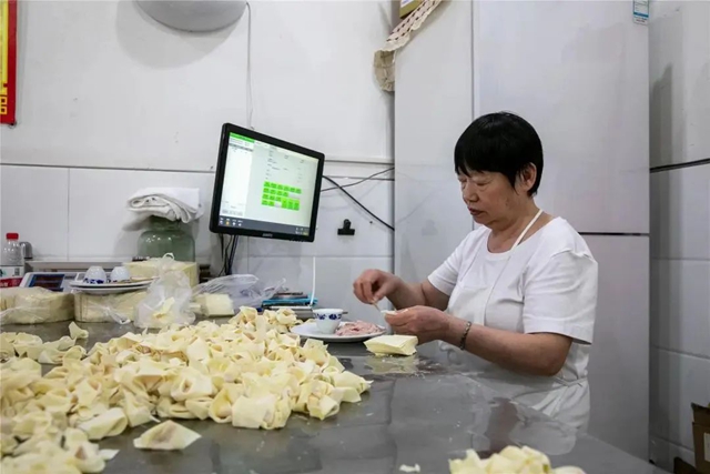 “老板,兩個(gè)大碗,一清一紅!”“紅湯,多放點(diǎn)辣椒!”早上7點(diǎn)半,云江大道旁的董老四包面店迎來早高峰。今年70歲的向有萍坐在餐臺(tái)前,雙手翻飛如蝶,幾秒鐘便捏出一個(gè)“元寶”狀的包面。她的兒子董俊成則在廚房里忙活,包面下鍋,面皮透出粉色的肉餡時(shí)迅速撈出,淋上紅亮的油辣子,香氣瞬間盈滿小店。
