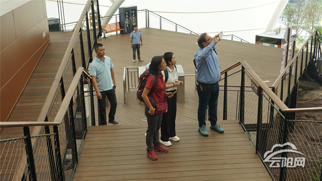 隨后,專家一行前往龍缸景區(qū)考察喀斯特地貌奇觀。深達335米的龍缸天坑壁如刀削,與暗河、溶洞等景觀共同構成“自然科學博物館”,其成因演化被科學界視為喀斯特研究的天然實驗室。尼古拉斯?祖羅斯對照地質圖冊感慨:“云陽將中侏羅世恐龍化石群與世界級天坑地貌集于一體,這種復合型地質價值在全球罕見。”陳羽嵐則從評估視角建議:“龍缸的地貌保護可進一步結合文化傳說,探索自然資源與人文元素的融合路徑,為后續(xù)再評估積累特色經(jīng)驗?!笨疾扉g隙,兩位專家還與云陽世界地質公園管理人員圍繞遺跡保護、科普創(chuàng)新等內容進行交流。