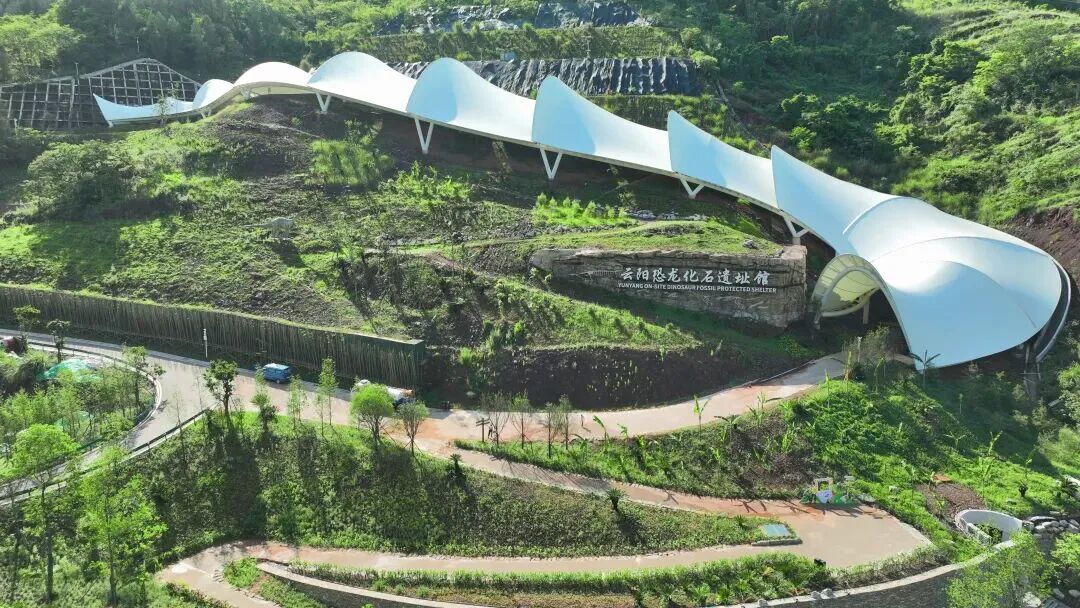 云陽恐龍化石遺址館擁有全球單體規(guī)模最大的侏羅紀(jì)原址化石墻,長150米、高6米的恐龍化石墻上,近5000塊化石密集鑲嵌,涵蓋頭骨、牙齒、椎體等骨骼,涵蓋蜥腳型類、獸腳類、鳥腳類、劍龍類、基干新鳥臀類五大類恐龍化石,近百條恐龍在此長眠,構(gòu)成了一個完整的恐龍群落。