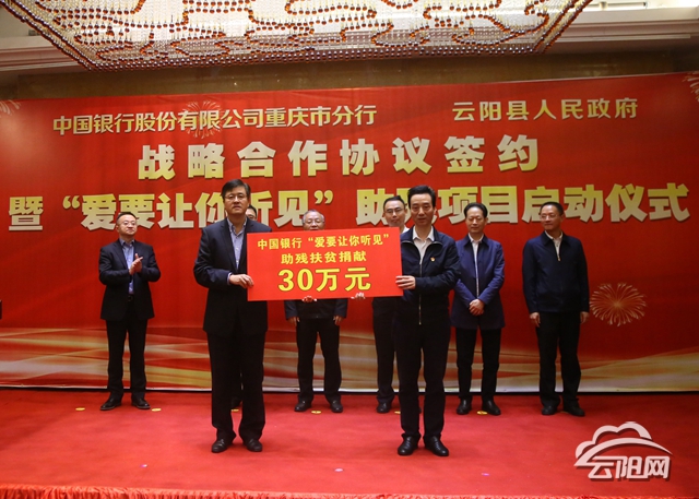 云陽網(wǎng)訊(記者 楊梅娜 丁齊)愛心點(diǎn)燃希望,奉獻(xiàn)成就夢想。10月30日,中國銀行“愛要讓你聽見”助殘扶貧項(xiàng)目啟動(dòng)儀式在我縣舉行。